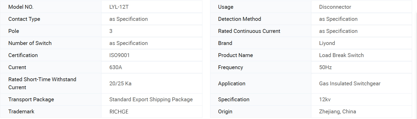 ЛИЛ-12Т прекидач оптерећења је у складу са релевантним захтевима ГБ3804-2004 „3,6кВ~40,5кВ високонапонски прекидач за оптерећење наизменичном струјом” и ГБ16926-1997 „Апарат за комбинацију прекидача за оптерећење наизменичне струје-осигурач”. Главно коло: 630А-20кА (4с), 25кА (3с); Механички век: 5000 пута; Коло уземљења: 20кА (2с); Механички век: 2000 пута.