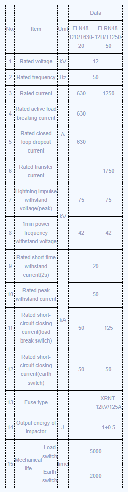 Технички параметри ФЛН48-12Д типа Индоор ХВ СФ6 пауза оптерећења