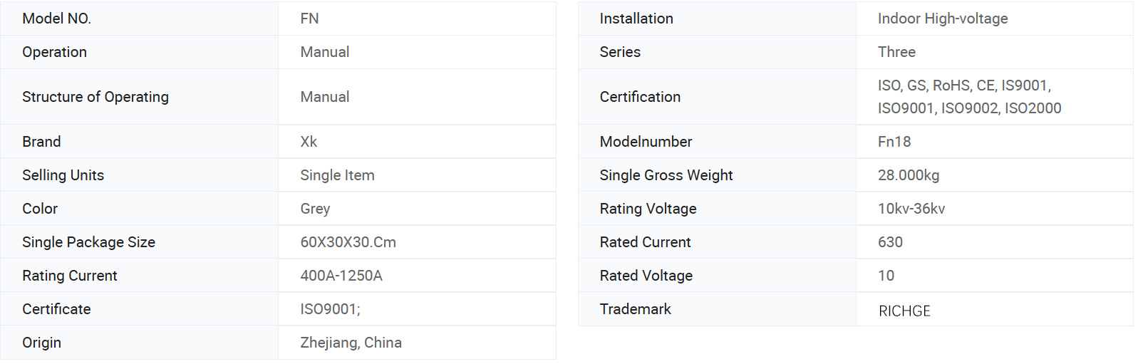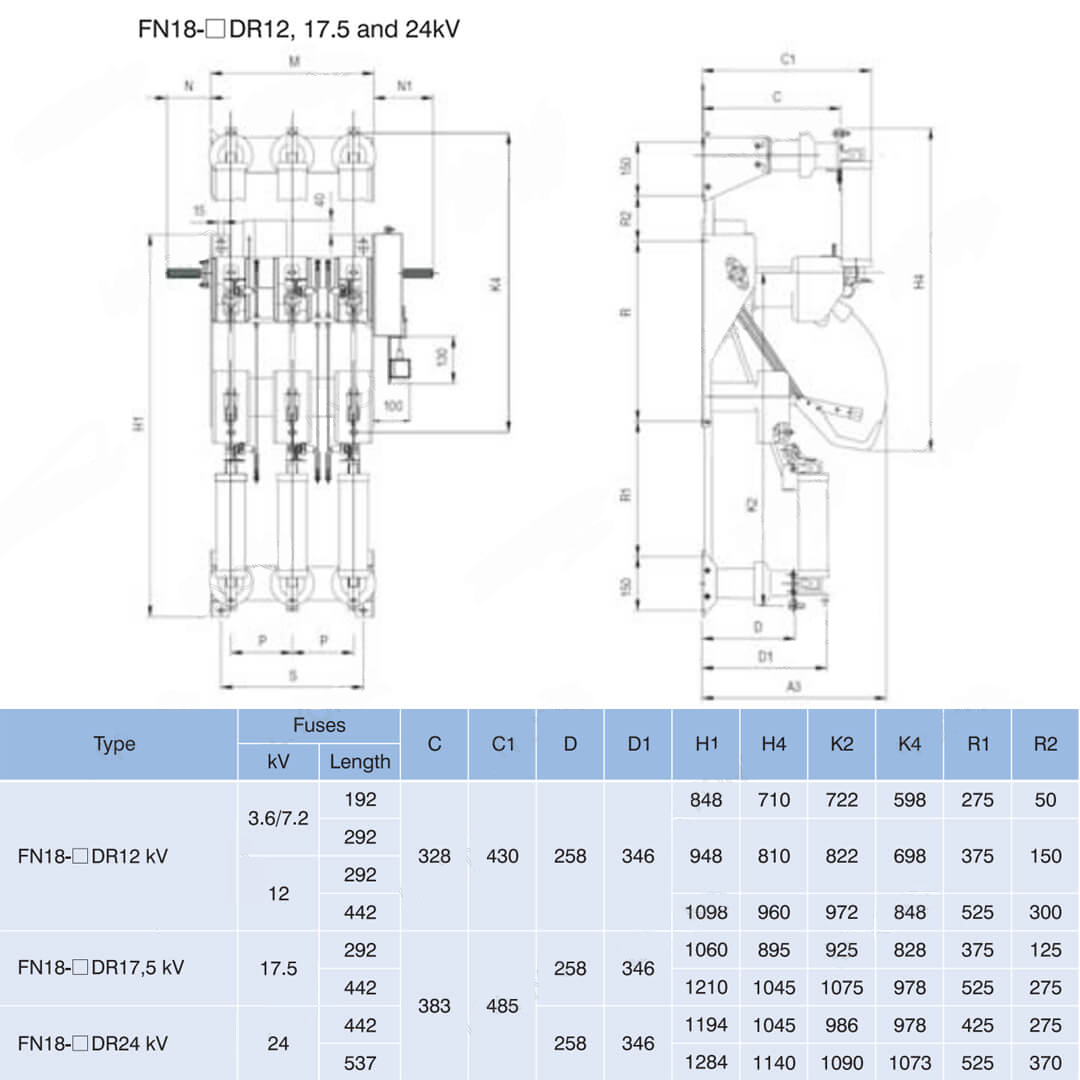 ФН18 прекидачи оптерећења и комбинације прекидача оптерећења и осигурача су високонапонски прекидачи оптерећења високих перформанси који комбинују гашење лука компримованим ваздухом и гашење лука произведеног гасом. Комбинација прекидача оптерећења и осигурача комбинује предности прекидача оптерећења са онима осигурача за пребацивање било које струје оптерећења до називне струје прекида оптерећења прекидача оптерећења, и за пребацивање било које прекомерне струје до називне струје прекида кратког споја комбинације помоћу рада осигурача и његовог импингера.