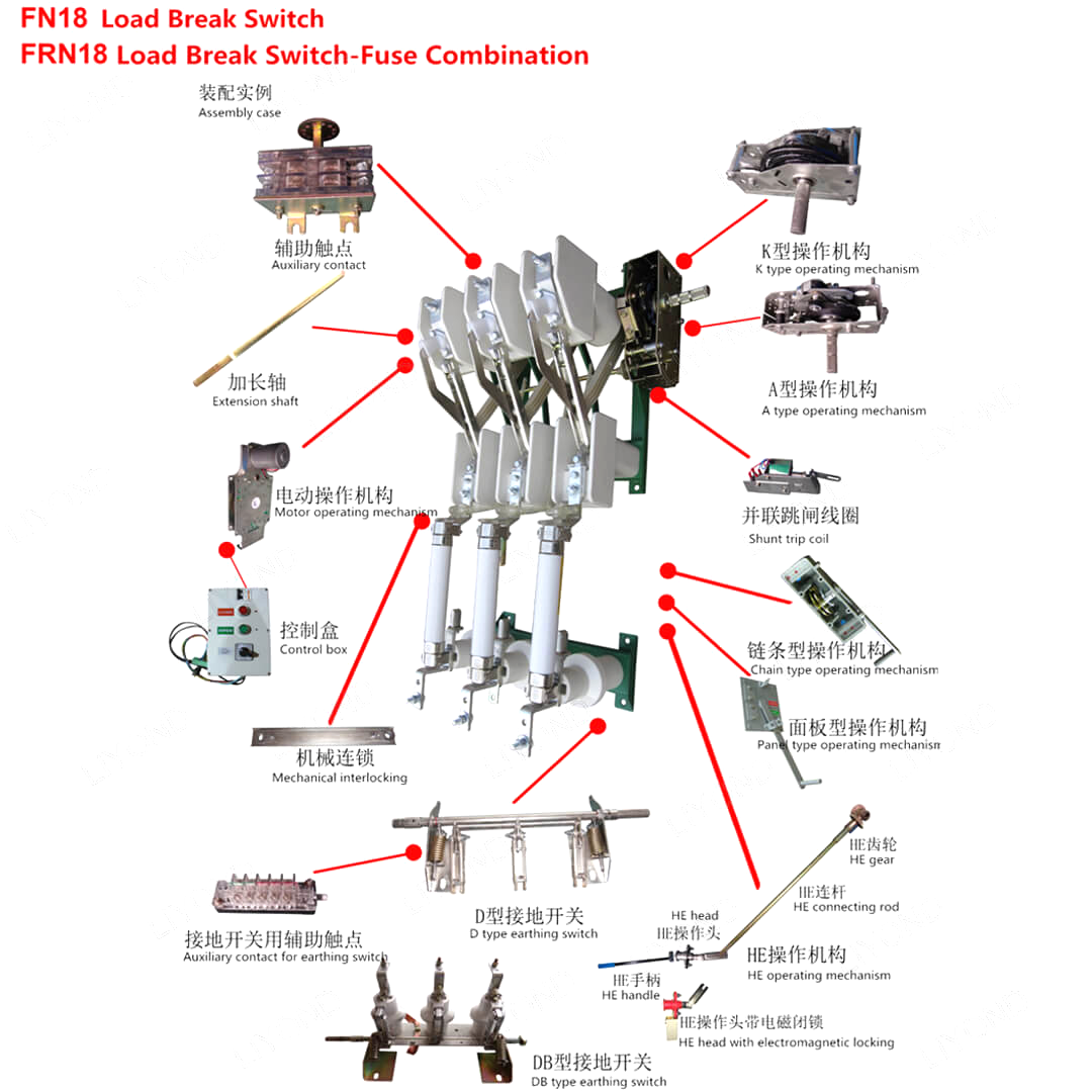 Стандардни Фн18 прекидач укључује тешки челични оквир са изолаторима за уклањање, јединствени систем за гашење АРЦ-а, оперативног механизма и компонентима за превоз струје, укључујући прекидаче са жицом и конекторима типа.