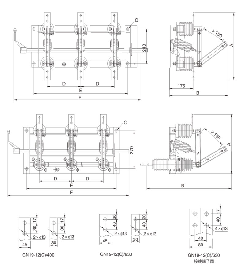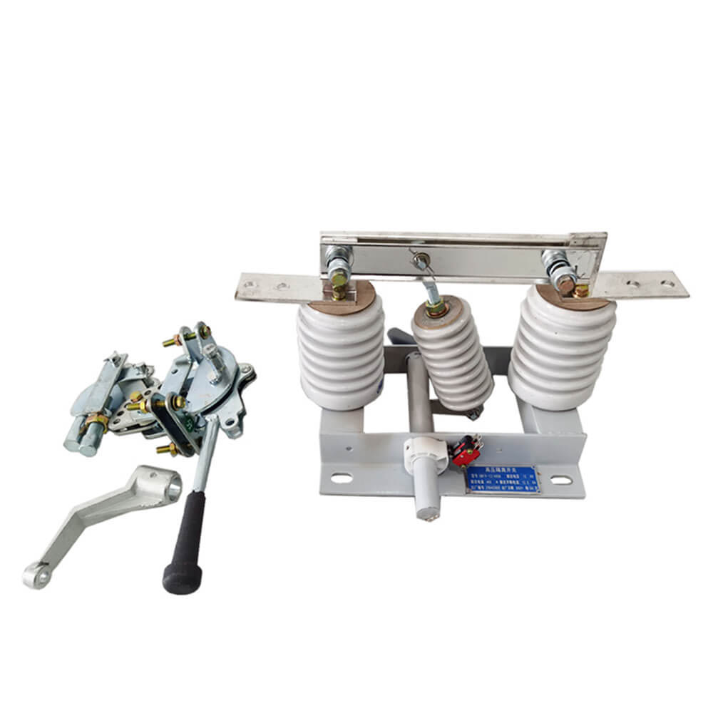 Проводни део ГН19-12 / 400, 630, 1000, 1250 прекидача за искључивање уписе фиксиран је на бази два стуба изолатора за сваку фазу. (ГН19-12Ц / 400, 630, 1000, 1250 тип има један изолатор стуба и један порцуланско кућиште.) Три фазе су уграђене паралелно, а проводљив део се састоји од статичких контаката контактних ножева и власника контаката (или проводљивих шипки). Свака фаза контактног ножа повезана је на средину изолатора кравате, изолатора за везање и инсталирану на базу повезане вретеном. Вретено је повезан са шипком за повезивање (кориснику) и ЦС6-1 врсту покретног механизма кроз кваку. Повезивање контактног ножа састоји се од две прорезне бакрене плоче, које не само да не само да подручје дисипације топлоте не само да спусти доњу температуру, али такође побољшава механичку чврстоћу контактног ножа, тако да је побољшана динамичка стабилност прекидача. Један крај контактног ножа монтиран је на контакт блок (или на проводљивој штапи) вијком (аутомобил Схав). ГН19-12 / 1000, 1250 у контакту са инсталацијом магнетне плоче за закључавање, стрлус пурницеЕ магнетске плоче за закључавање је да када је велика струја кратког круга да побољшају два утора контактирају нож између | атракција. ГН19-12 / 400, 630 прекидачи за искључивање је мале границе кроз струју, тако да нема потребе да додате магнетну плочу за закључавање.