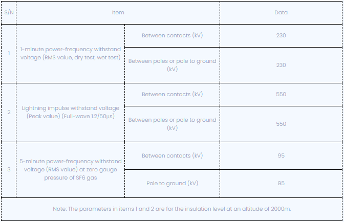 Због инхерентне снаге изолације су сумпорни хексафлуоридни гас и оптималан контакт кретање прекидача круга, прекидач прекида прекида капацитивне струје без поновне преграде; Спољни ниво изолације је висок, спољна изолација је дизајнирана са великом удаљеном прекривача, растојање омјера прекривања је ≥31мм / кВ, а перформансе отпорности на прљавштини су одлични. Такође може безбедно радити у оштром окружењима;