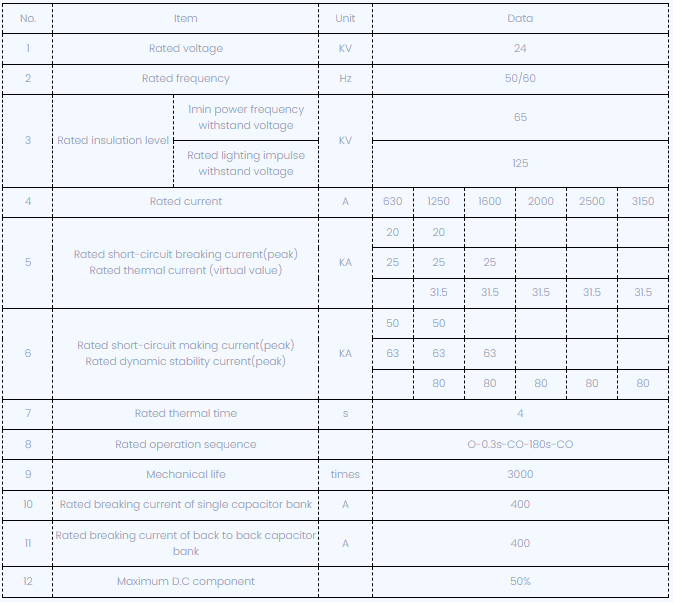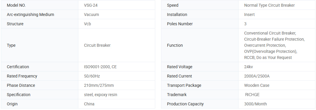 ВСГ-24 Серија у затвореном кругу високог напона са уграђеним половима је три фазе А.Ц 50Хз опреме за дистрибуцију електричне енергије са називним напоном од 24кВ. Користи се за заштиту и контролу електричне опреме у областима индустрије и МИнг Ентерприсе, електрана и подстанице. Главни проводљиви круг овог типа Вакуумски прекидач користи уграђени пол, подударан са модуларном организацијом и интегрисаном ручицом за складиштење енергије. Укупни изглед је разуман, савршено сажетошћу и заиста схвата слободно одржавање и дужа механички и електрични живот.