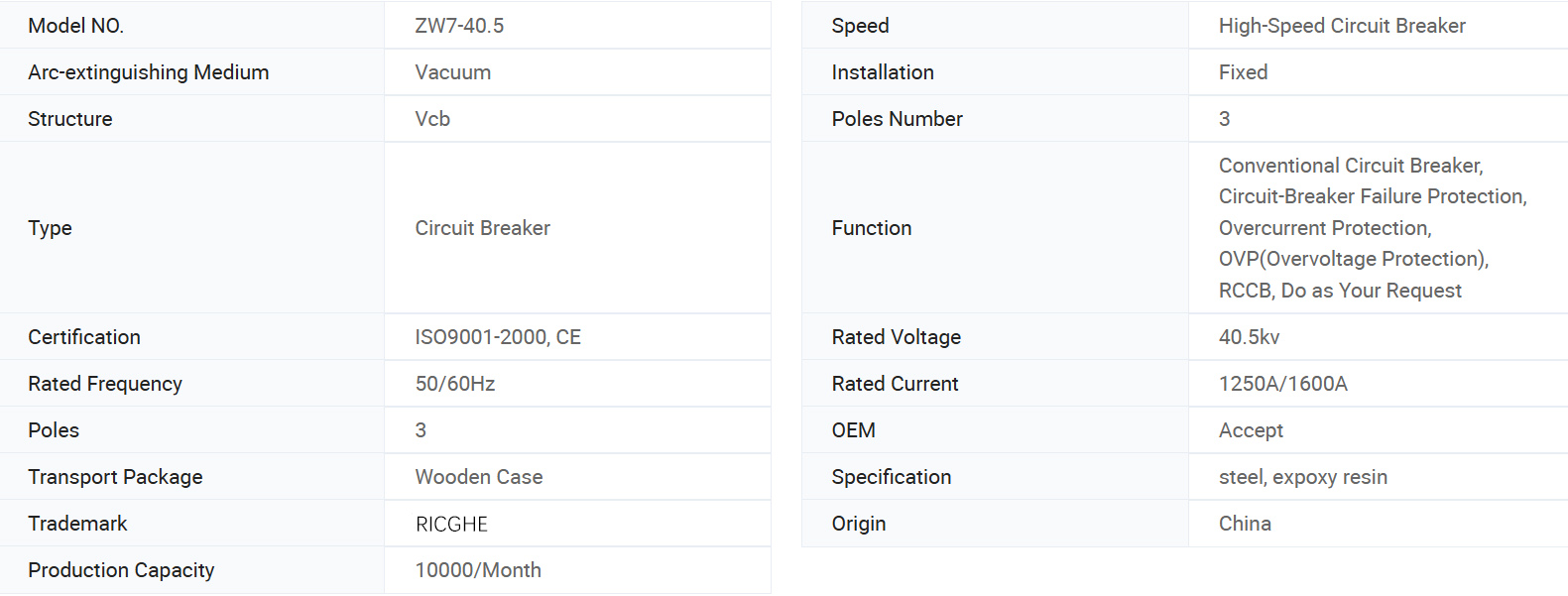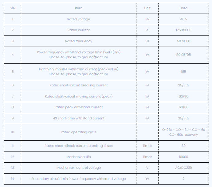 Главне карактеристике прекидача круга су одлична перформансама, вакуум лук, високи капацитет, механички живот до 10000 пута, једноставна структура, без одржавања и дугог циклуса одржавања; Добре перформансе изолације и снажна способност за загађење; Тренутни трансформатори могу се инсталирати у складу са захтевима купаца, са тачношћу мерења до нивоа до 0,2, омогућавајући трофазну интеракцију. Стандард: ИЕЦ 62271-100